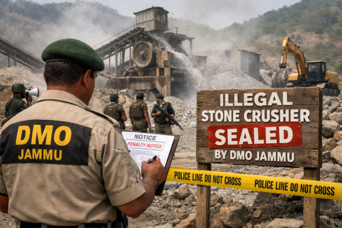 Jammu, March 25: The District Mineral Office (DMO) Jammu has intensified its crackdown on illegal mining, detecting major violations during inspections of stone crusher units in the Gharota area. Officials said large quantities of unaccounted minor minerals—including crushed bajri, sand, dust, and nallah muck—were found stored without proper authorization.